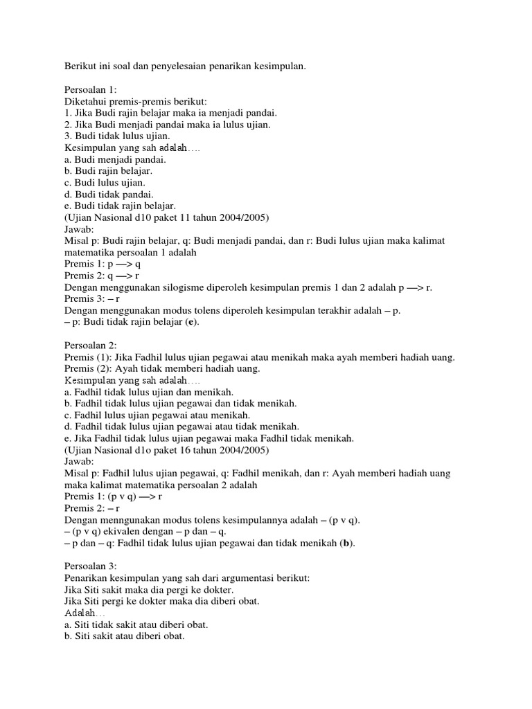 From i.ytimg.com untuk menjawab soal ini, kita gunakan konsep logika matematika berkuantor universal, yaitu premis dengan kata semua. Soal dan jawaban premis : Soal dan jawaban premis / contoh soal dan jawaban teknik sipil. Soal dan jawaban premis : Berlatihlah agar memudahkan kamu menjawab soal seperti model tersebut. Cara menjawab soal logika formil. Contoh silogisme pengertian jenis jenis contoh soal. Jadi, ingkaran untuk soal di atas adalah: Sehingga mempemudah kita dalam menjawab soal sinonim ini. Teks berikut ini digunakan untuk menjawab soal 1 sampai 3. Modus tollens berarti jika diketahu p q dan q maka bisa ditarik kesimpulan p. C 2) berikut ini yang tidak termasuk criteria kualitas asuhan keperawatan adalah: Teks berikut ini digunakan untuk menjawab soal 1 sampai 3.